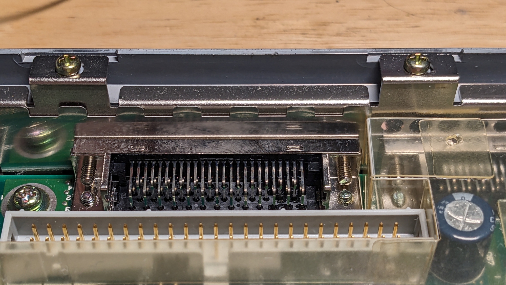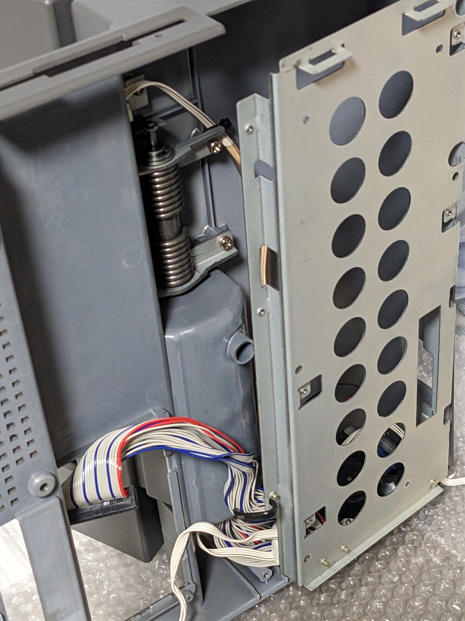 上の写真は組み立て時の写真なのでSCSIケーブルが接続された状態になっていますが、分解作業時はこの時点でSCSIケーブルも外してください。