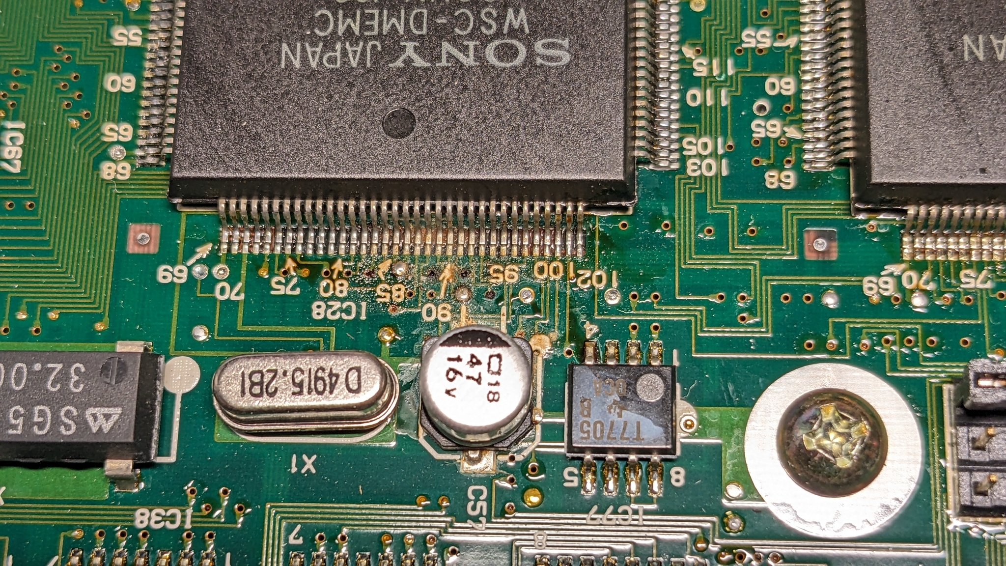 事前情報で「4級塩電解コンデンサの液漏れ」が明らかになっていたDMEMCゲートアレー周辺の写真が以下。